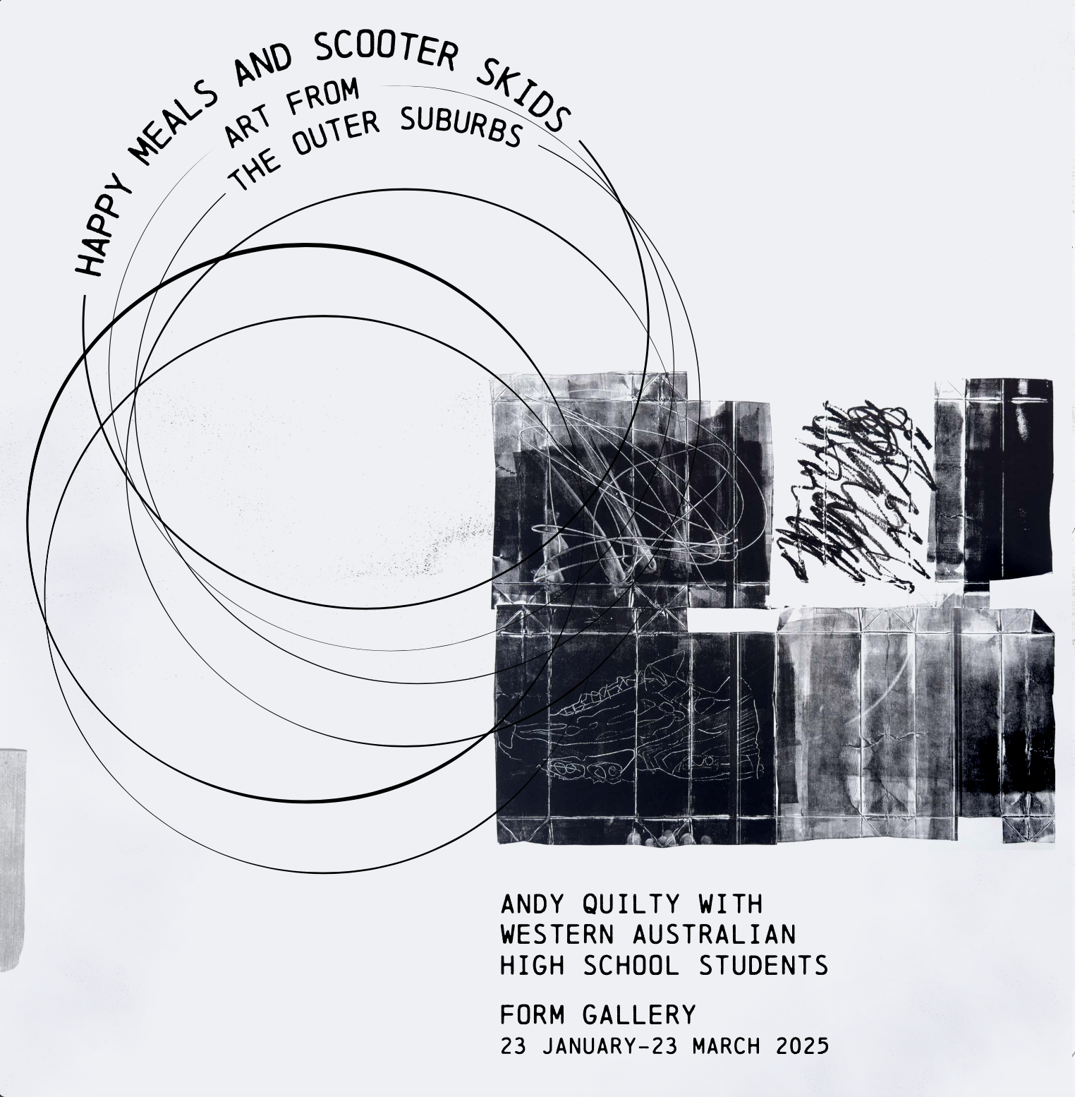 Logo, signage for the exhibition "Happy Meals and Scooter Skids: Art From the Outer Suburbs" at FORM Gallery, 2025.
